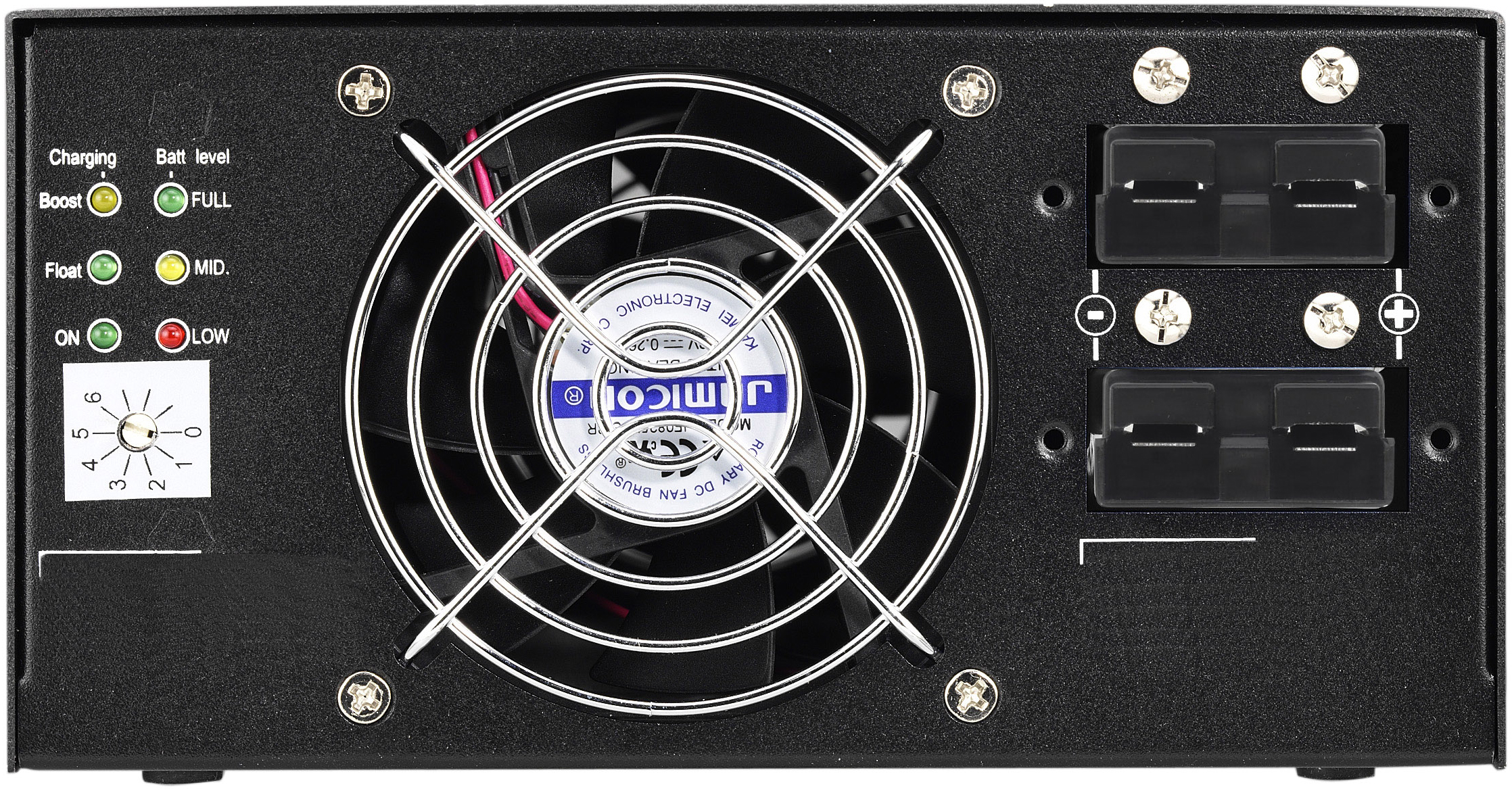 External charger in a stand-alone housing. Works parallel to the UPS. You can connect your battery pack via connector (96VDC). Charger has adjustable current up to 10A.