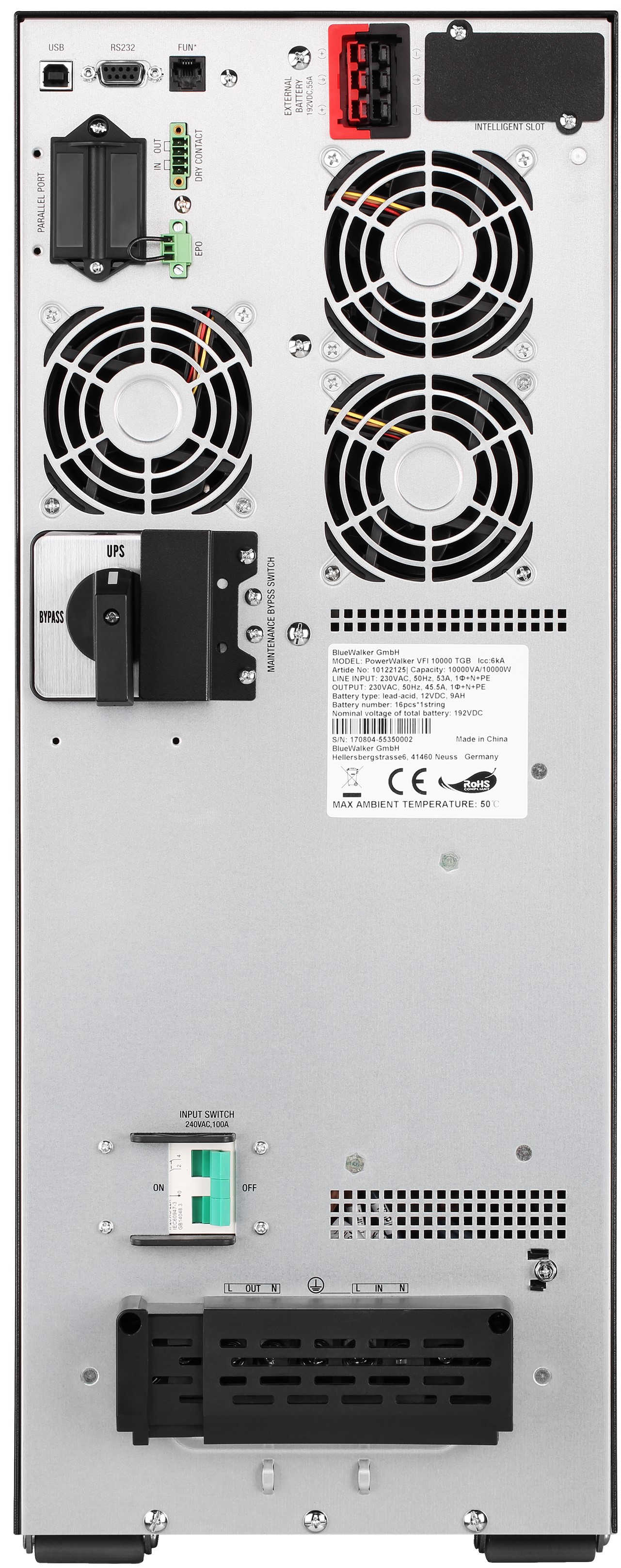The PowerWalker VFI TG/TGB/TGS is a professional and versatile online UPS solution for almost all single-phase applications. The UPS is available in different versions: TG: with internal batteries for regular backup times TGB: with internal batteries and connection for external battery packs for extended autonomy times TGS: without internal batteries, but with a powerful charger for very long autonomy times